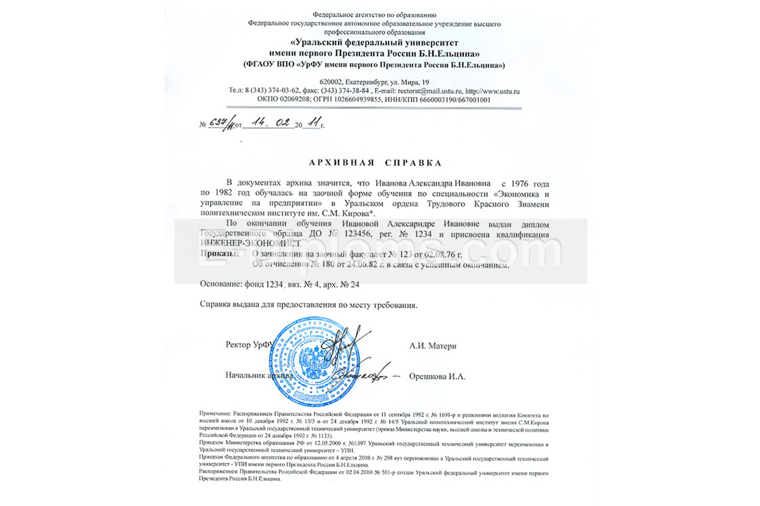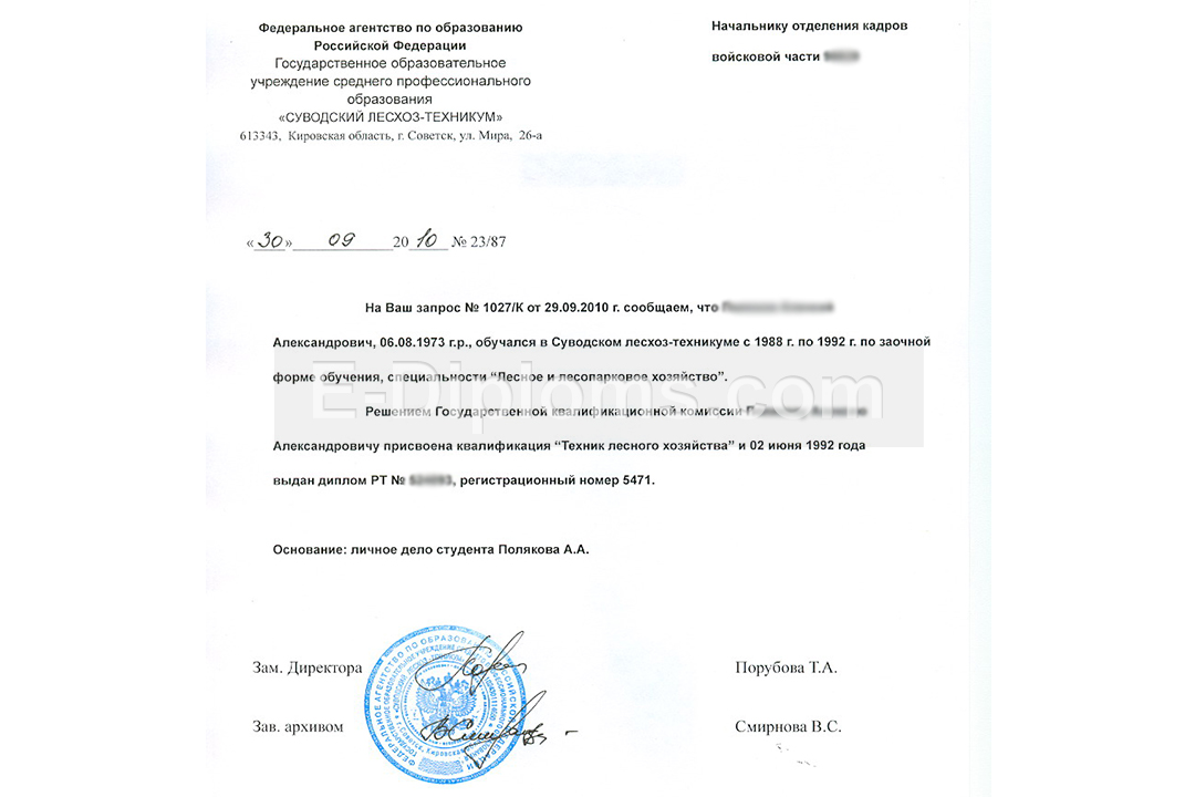 Вы можете купить архивную справку, подтверждающую факт Вашего обучения в вузе или колледже / техникуме, а также факт выдачи диплома об образовании. Справка обязательно содержит информацию о том, в какой период и по какой специальности обучался студент, а также серию и номер полученного документа. Заполняем по образцу выбранного учебного заведения. Доставка бесплатна, оплата при получении, для проживающих в регионах доступна услуга «макет», есть скидки. При заказе до 14.00 привезем уже завтра!