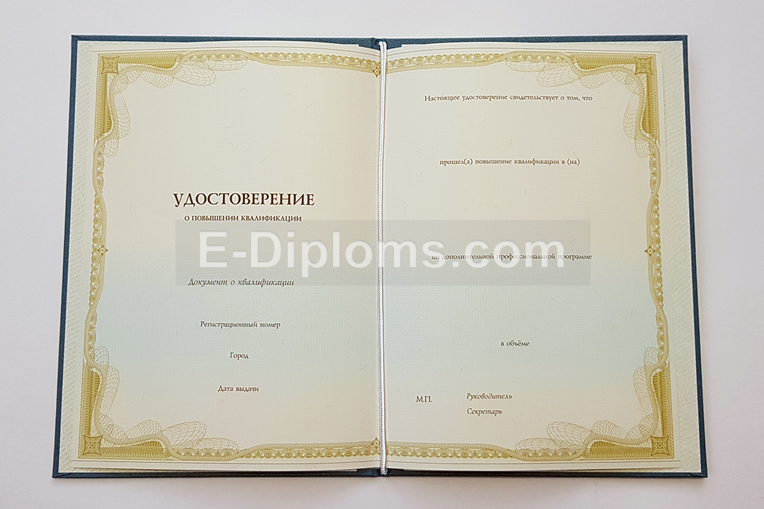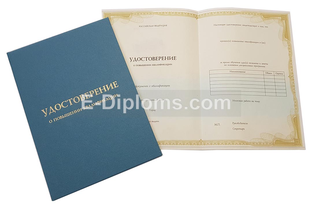У нас на сайте Вы можете купить удостоверение о повышении квалификации на бланке установленного образца в Москве, а также других городах России. Изготовим качественные корочки быстро, профессионально, анонимно. Доставка бесплатна, оплата при получении, для проживающих в регионах доступна услуга «макет», есть скидки. При заказе до 14.00 привезем уже завтра!